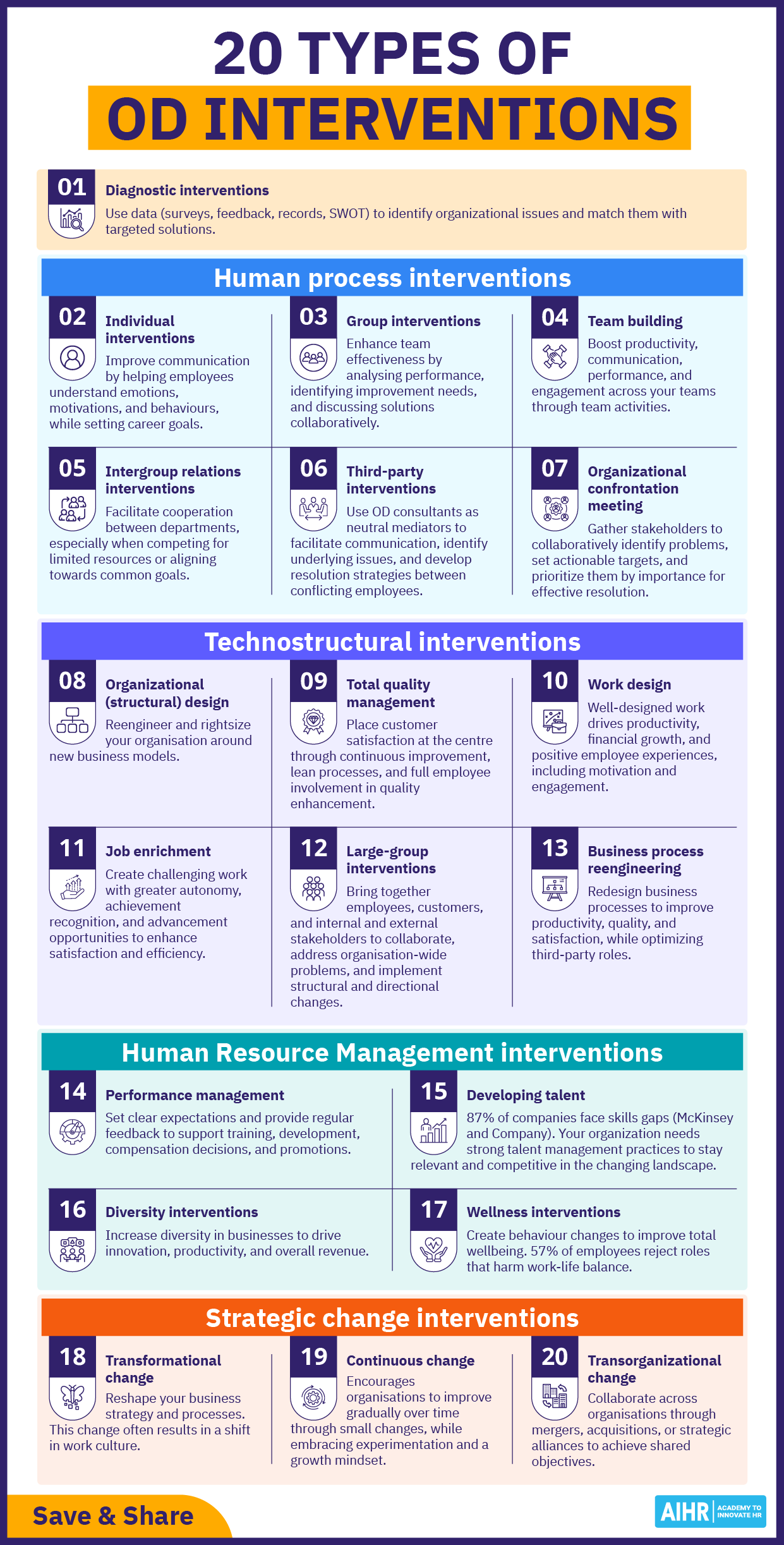 This cheat sheet provides a structured overview of 20 types of organizational development (OD) interventions across key categories. It is designed for HR professionals and leaders seeking practical ways to improve organizational effectiveness and drive change.