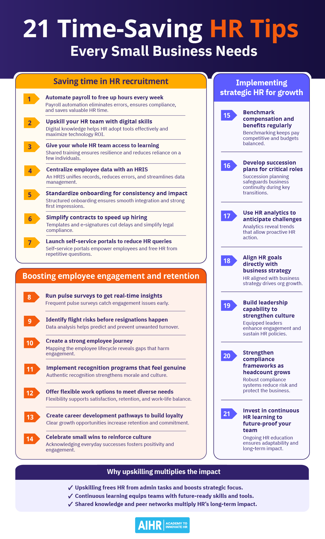 This cheat sheet presents 21 practical, time-saving HR tips designed specifically for small businesses. It helps HR professionals streamline daily operations, strengthen employee engagement, and support sustainable business growth.