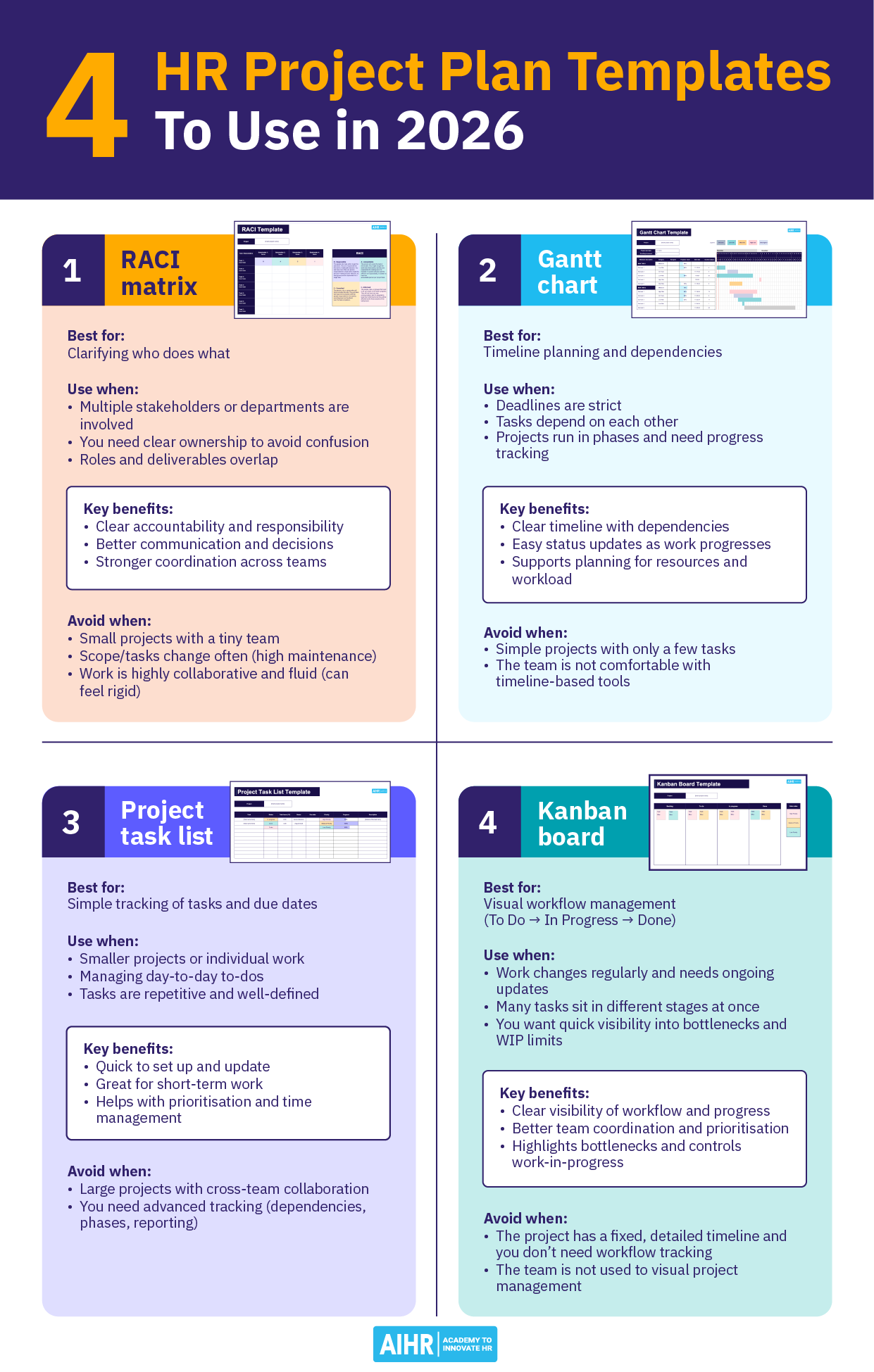 This cheat sheet provides an overview of four essential HR project planning templates and when to use each effectively. It is designed to help HR professionals select the right tool to manage tasks, timelines, responsibilities, and workflows.