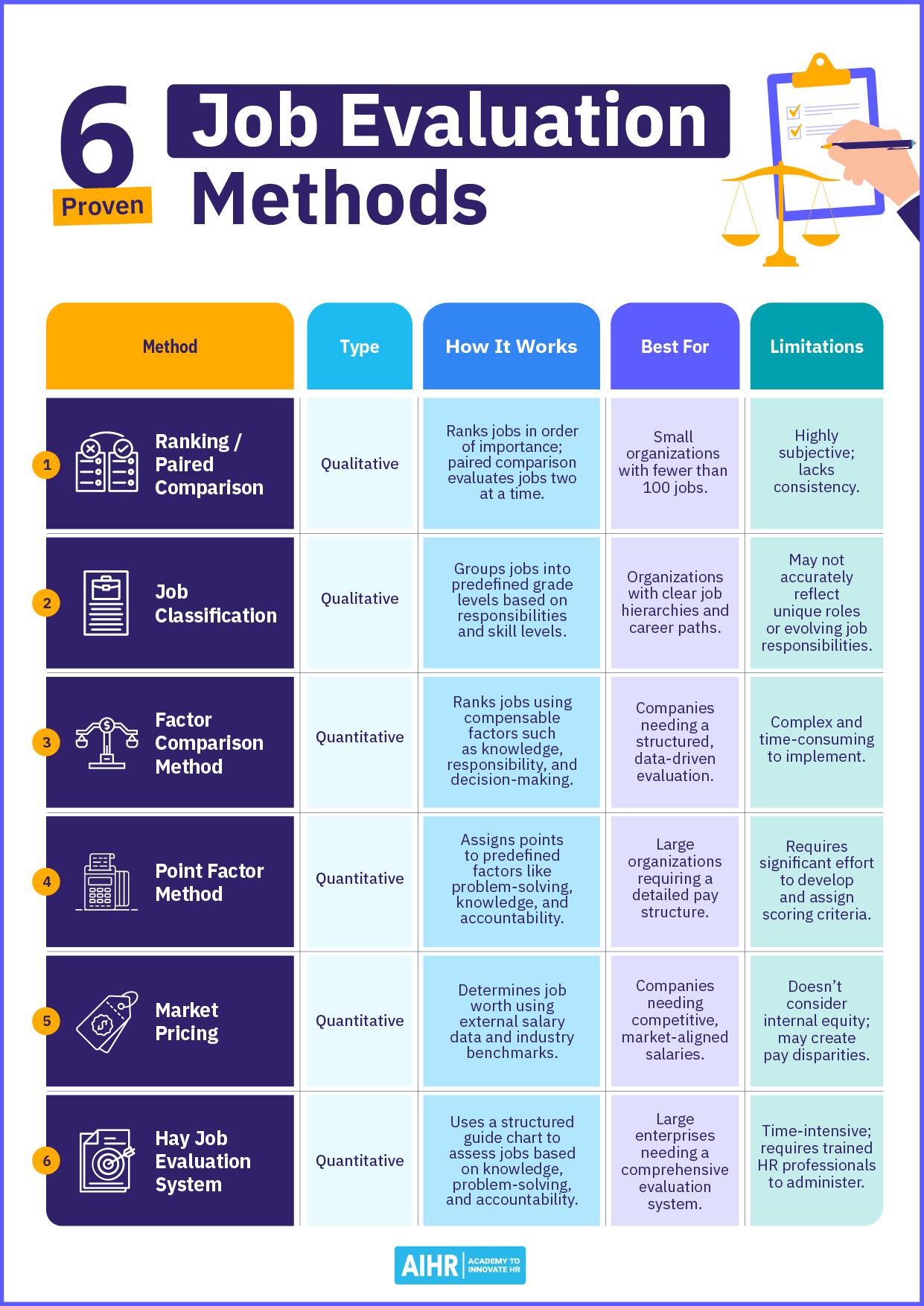 This infographic provides a comprehensive overview of six proven job evaluation methods. It helps HR professionals determine the relative worth of a job to an organization.