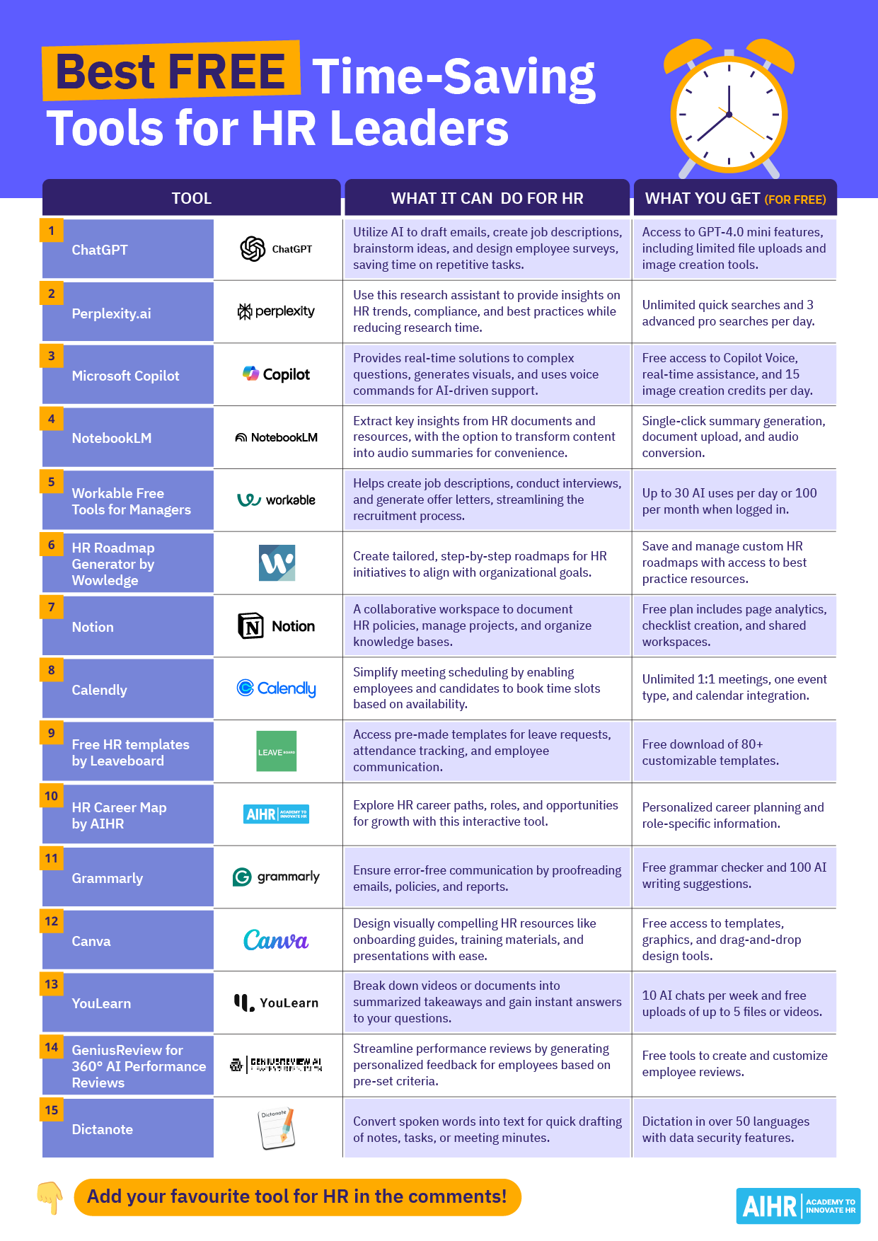This resource highlights 15 free digital tools that help HR leaders save time, improve productivity, and streamline processes across different HR functions.