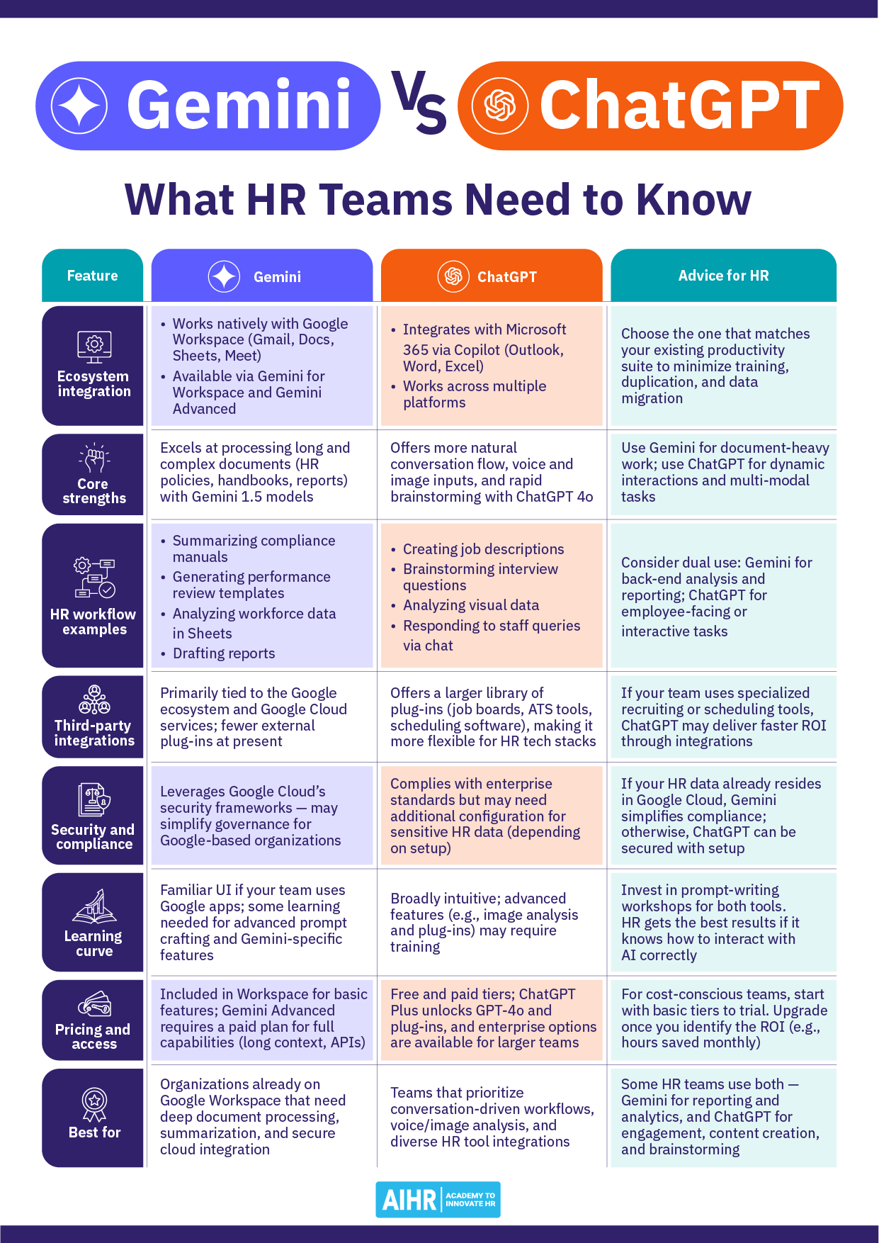 This infographic provides a side-by-side comparison of Google’s Gemini and OpenAI’s ChatGPT, outlining their features, capabilities, and key considerations specifically for HR teams looking to integrate generative AI tools into their workflows.