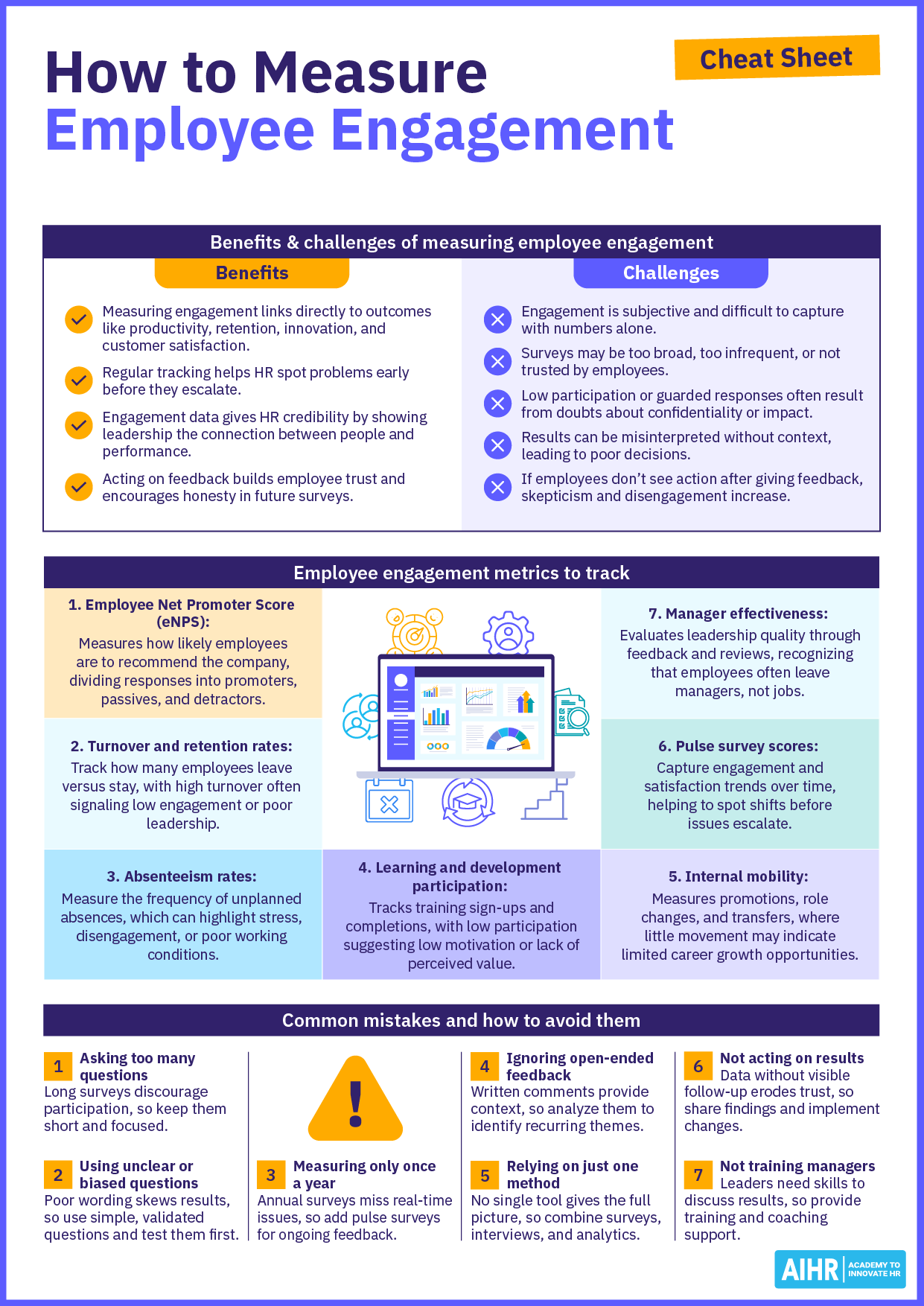 This cheat sheet provides HR professionals with a practical overview of how to measure employee engagement using qualitative and quantitative methods. It supports informed decision-making by outlining benefits, challenges, key metrics, and common pitfalls in engagement measurement.