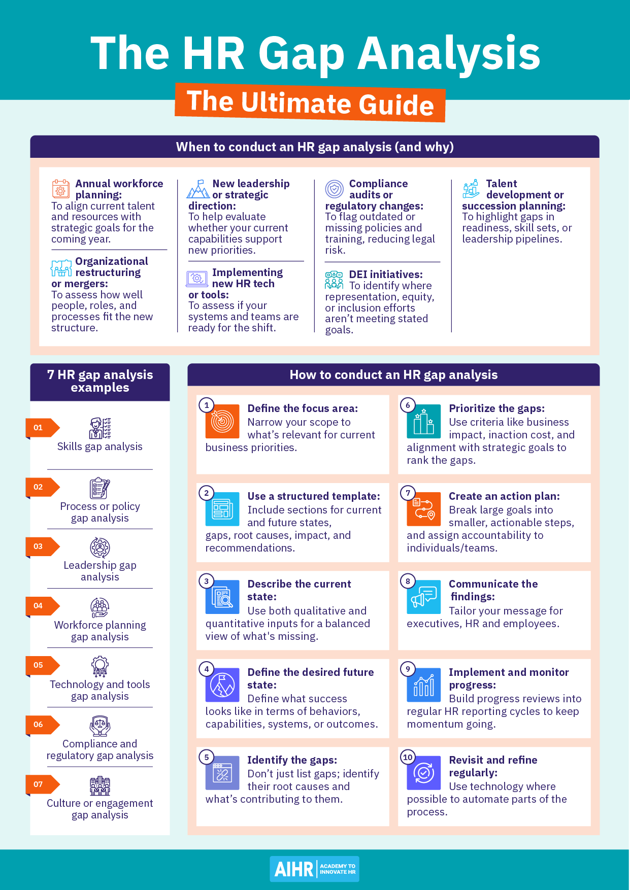- Step-by-step guidance on how to conduct an HR gap analysis from focus definition to review
